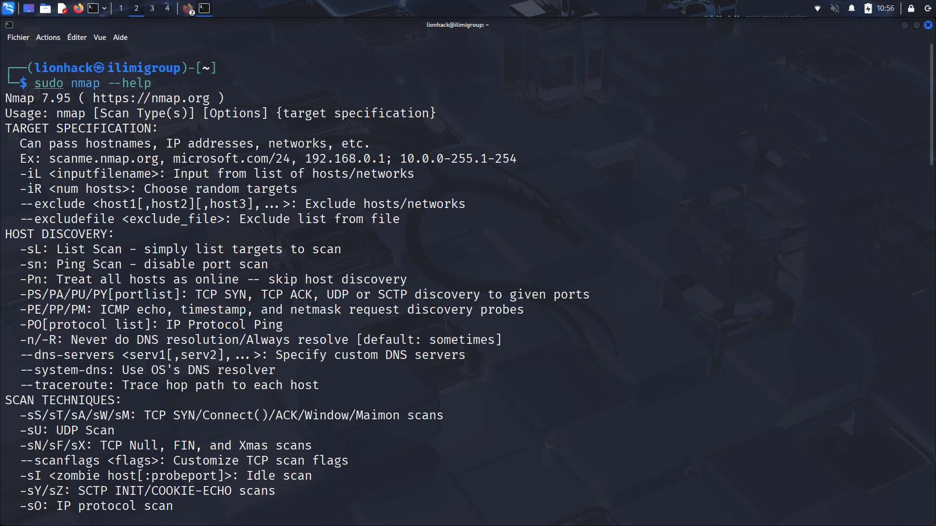 Nmap est déjà installé sur kali donc nous allons ouvrir un terminal et taper la commande nmap -h pour voir les requêtes dont il dispose