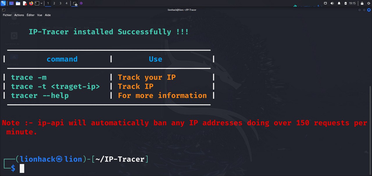 Vous pouvez aussi exécuter la commande ip-tracer pour connaitre la liste des différents arguments que vous pourrez utiliser dans un cadre légal et controlé car la cybercriminalité est punie par la loi.
